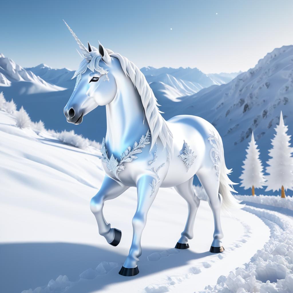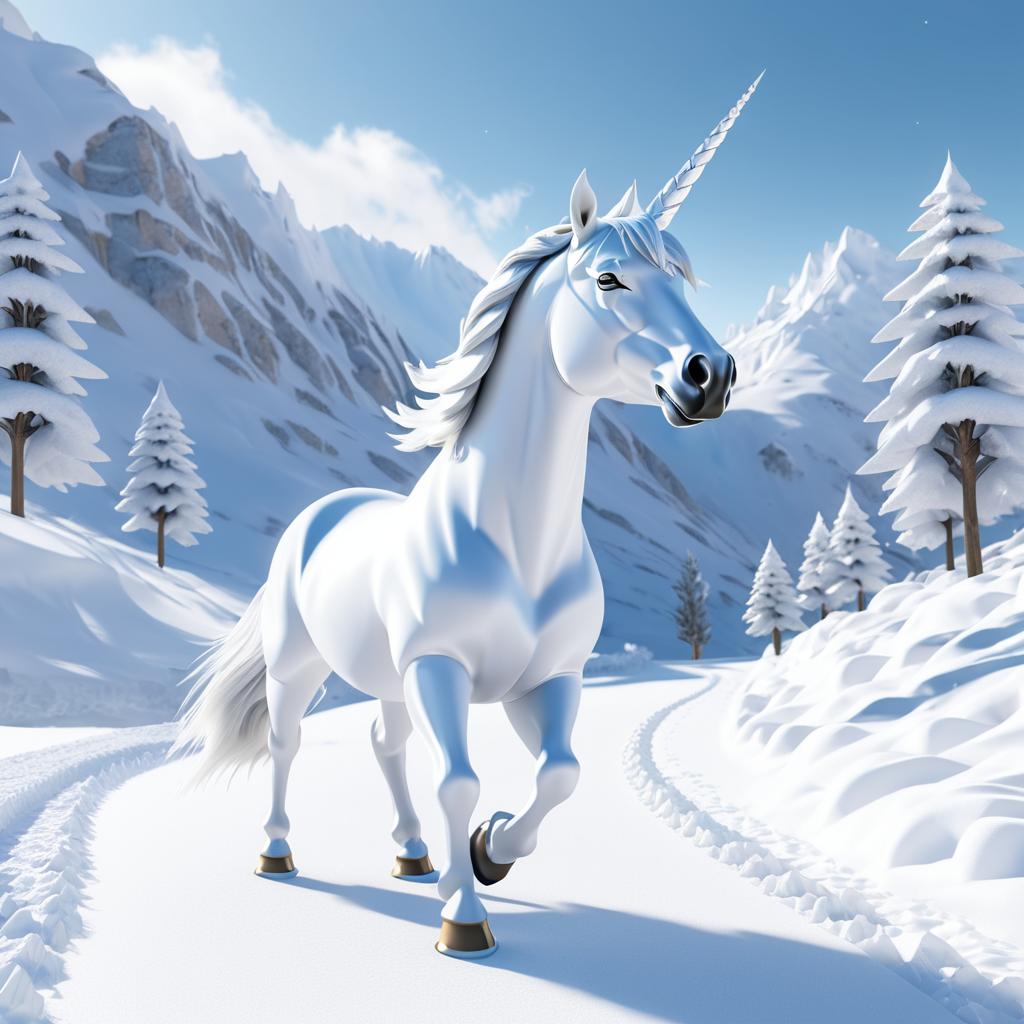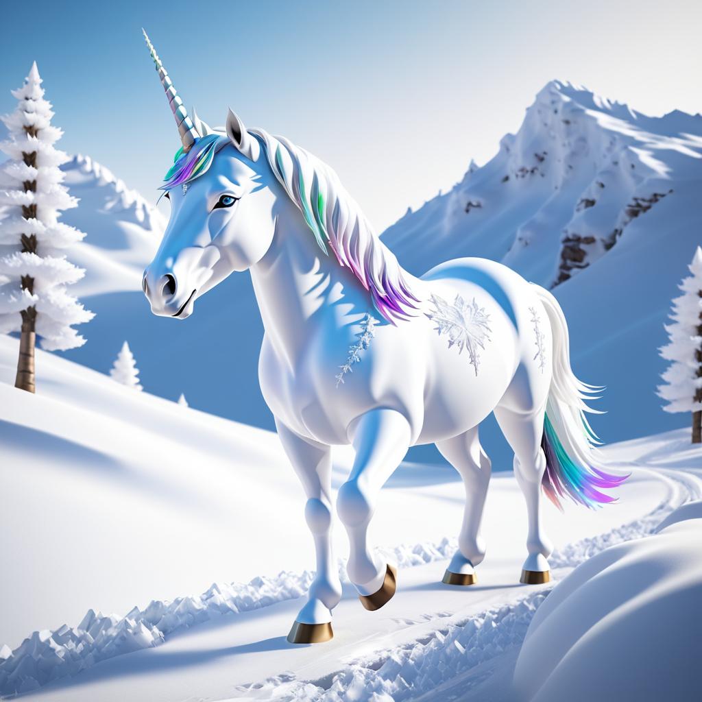 A majestic white unicorn with intricate snowflake patterns on its body stands in a snowy mountain landscape. The unicorn has a long spiraled horn, light blue mane and tail, and golden hooves. Surrounding the unicorn are snow-covered pine trees and a winding snow trail beneath a clear blue sky.