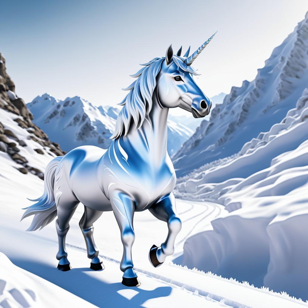 A snow unicorn on a path in snowy mountains, rendered with ultra-realistic graphics, octane render, depth of field, highly detailed and cinematic.