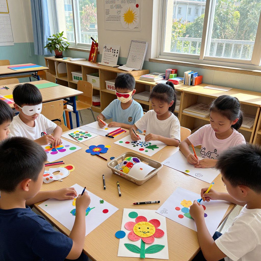 Photo prompts for kids: A classroom craft session where children are creating paper flowers, masks, and decorations with bright crayons and glue, sunlight streaming through windows, inclusive and educational environment