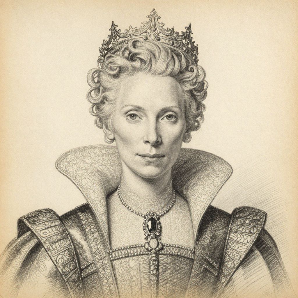 Black-and-white drawing of a regal woman with curled hair, wearing an elaborate crown, high-necked Renaissance gown, and ornate necklace.