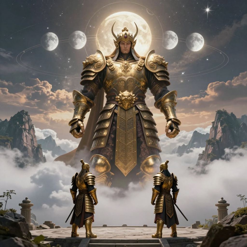This is a digital artwork depicting a towering, armored figure with a horned helmet standing on a misty, mountainous terrain. The central figure, adorned in intricate, golden armor, dominates the scene with a radiant, full moon behind his head, surrounded by smaller moons. Two smaller armored figures, one on each side, stand at his feet. The background showcases rugged mountains and a cloudy sky with a starry night. The golden armor features detailed engravings and the central figure's cloak billows behind him. The overall style is hyper-realistic with a fantasy theme, emphasizing grandeur and power.