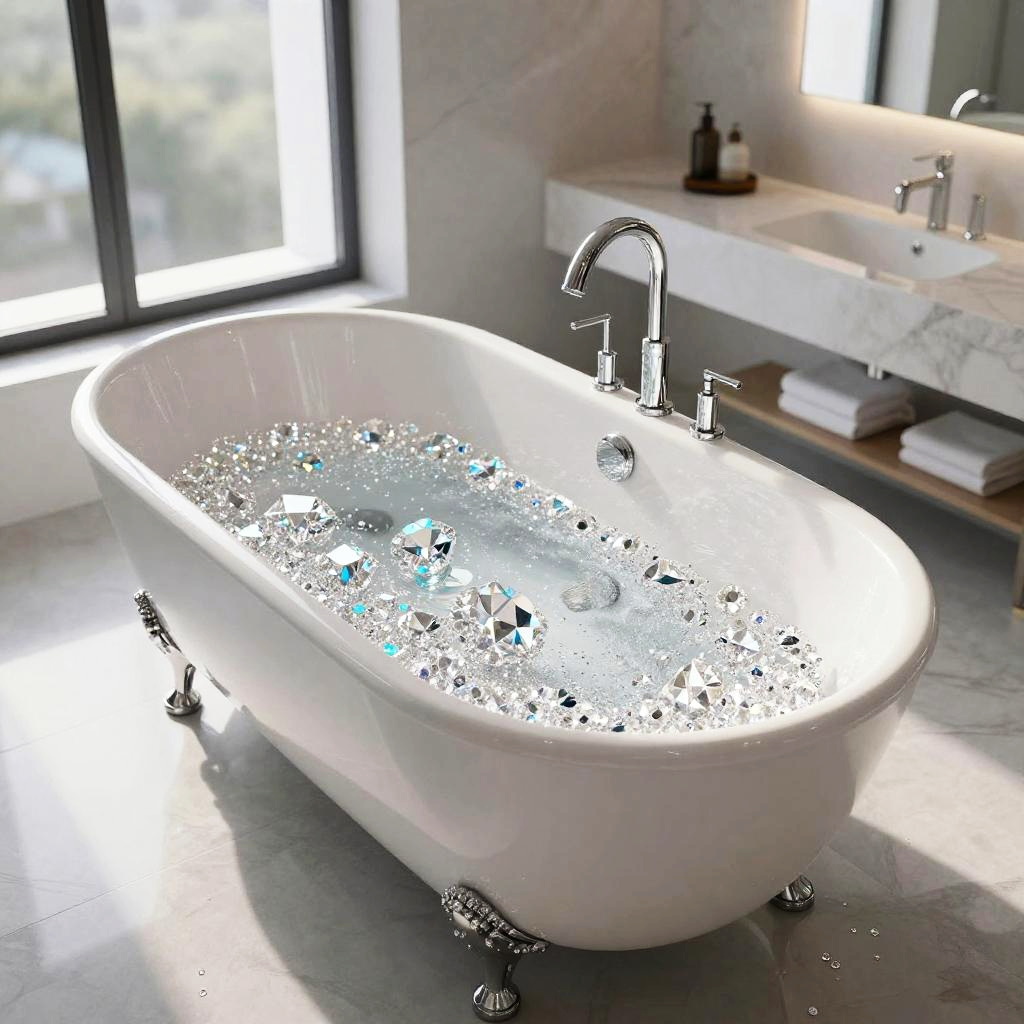 Bathtub full of diamonds shimmering vividly, modern sleek bathroom setting with chrome fixtures, bright natural light streaming through large windows, opulent and surreal scene