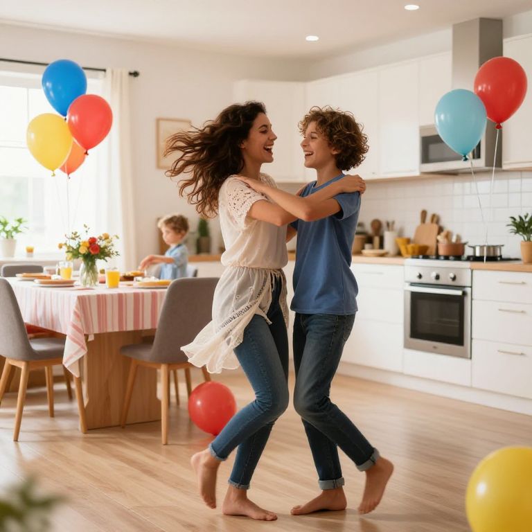 Sister and brother dancing in a bright kitchen during a family celebration, balloons, laughter, festive table, vibrant colors, dynamic movement, joyful environment, lively and warm tone.