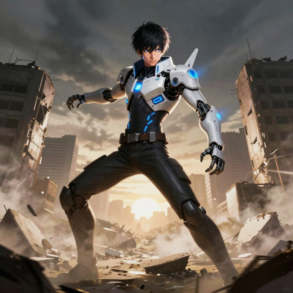 Anime guy short hair with futuristic armor, glowing blue accents, robotic arm, cybernetic enhancements, standing in a dystopian wasteland with ruined buildings, dramatic lighting and high contrast, bold dynamic composition with energetic pose