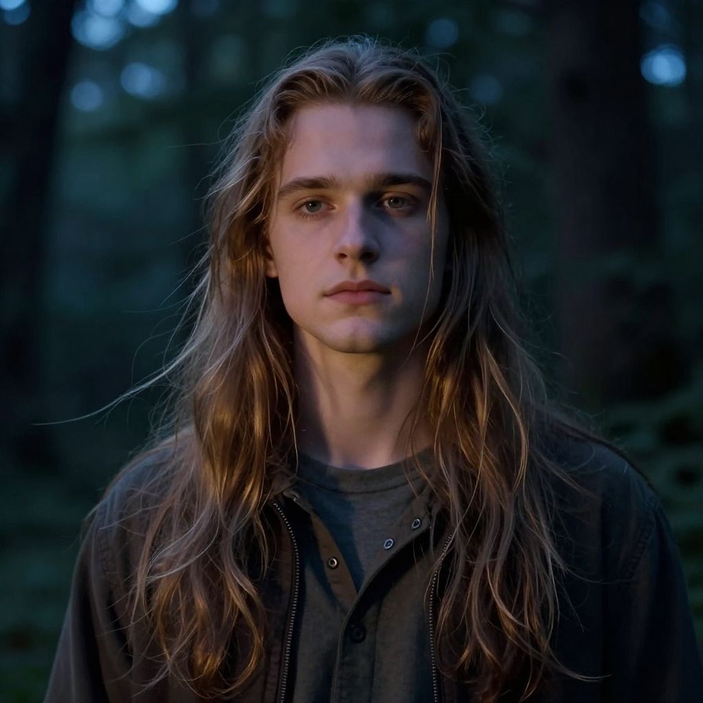 Photograph of a young Caucasian man with long, wavy brown hair and fair skin, standing in a dark, forested background. He has piercing blue eyes, a serious expression, and is wearing a dark gray, button-up shirt with a black zip-up jacket over it. The lighting is dim, with blue and green hues from the forest, highlighting his hair and face. The background is blurred, emphasizing the subject's focused gaze. The overall mood is mysterious and contemplative.