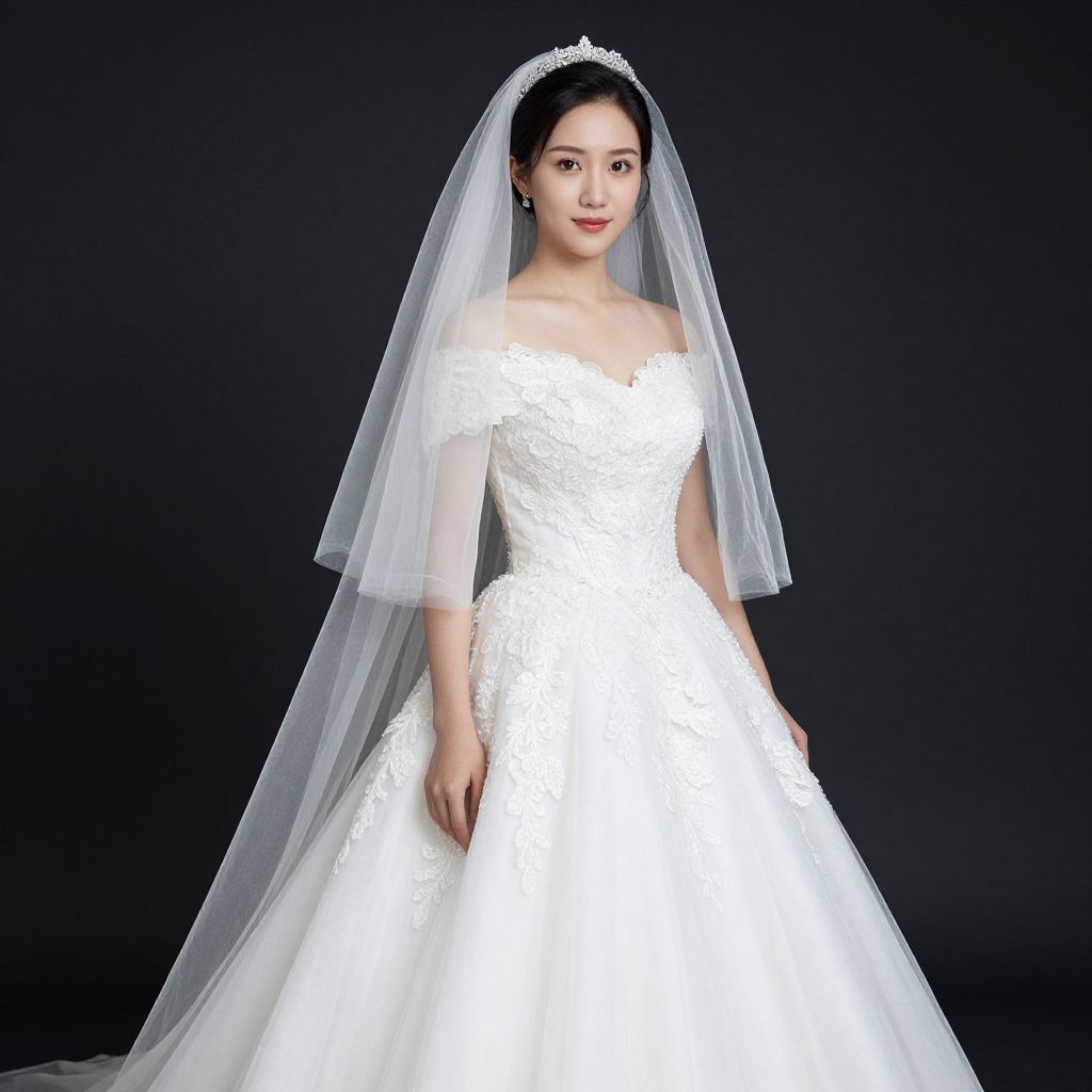 Photograph of an Asian woman with fair skin, black hair, and red lipstick, wearing an off-shoulder, white lace wedding dress with a voluminous skirt. She has a delicate, sparkling tiara and a long, sheer veil that drapes over her shoulders and down her back. Her expression is calm and composed, with a slight smile. The background is solid black, making her and the white dress stand out prominently. The dress has intricate lace detailing on the bodice and a textured, tulle skirt. She is standing upright, with her hands gently resting by her sides.