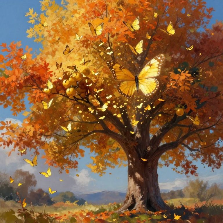 A vibrant digital artwork depicts a majestic tree adorned with autumnal hues, where its fruit transforms into a burst of golden butterflies, symbolizing the release of forgotten lullabies carried by the wind, rendered in a high-definition, impressionistic style with dramatic lighting effects.