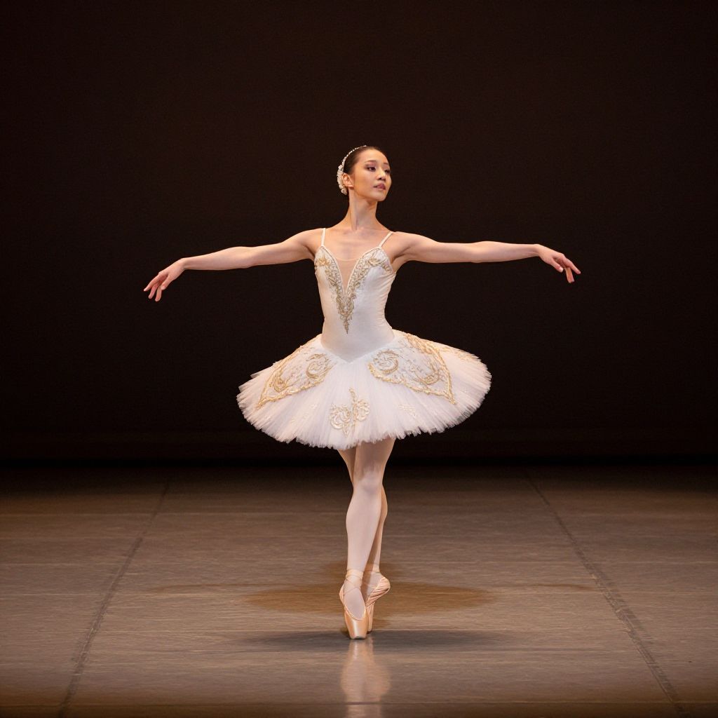A ballerina standing center stage in a dimly lit theater, her solo performance highlighting her delicate movements and the intricate patterns of her costume under the spotlight.