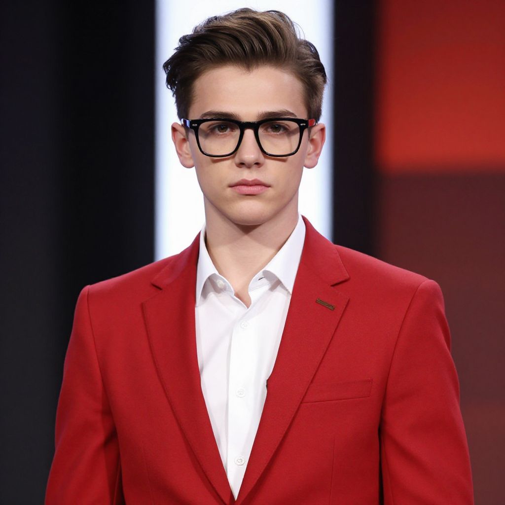 Photograph of a young white male model with short, dark brown, neatly styled hair, wearing large black-rimmed glasses. He has a fair complexion and is dressed in a vivid red suit jacket over a crisp white dress shirt. The background is blurred but features a bright white vertical light and a red section, creating a modern, high-fashion runway setting. The model's expression is neutral, with slightly parted lips, exuding a confident and poised demeanor.