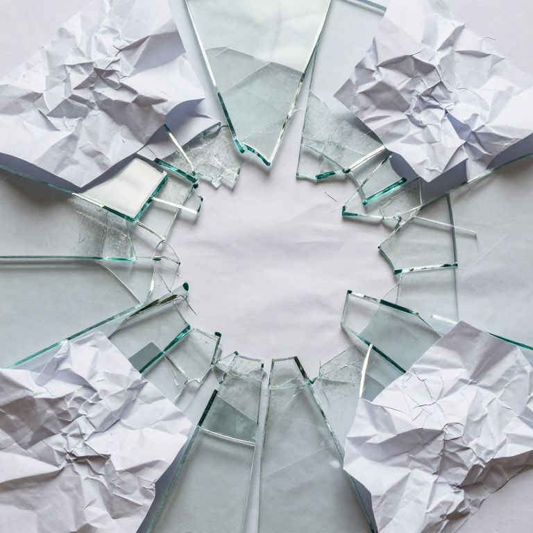 An abstract photograph of crumpled paper and shattered glass arranged in a pattern that visually represents the concept of failure and its emotional weight.