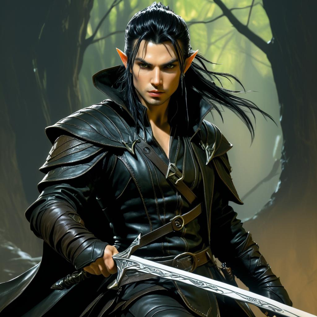 Artistic portrait of a cunning elven rogue, styled in dark leather attire, by Kim Jung Gi, Greg Rutkowski.