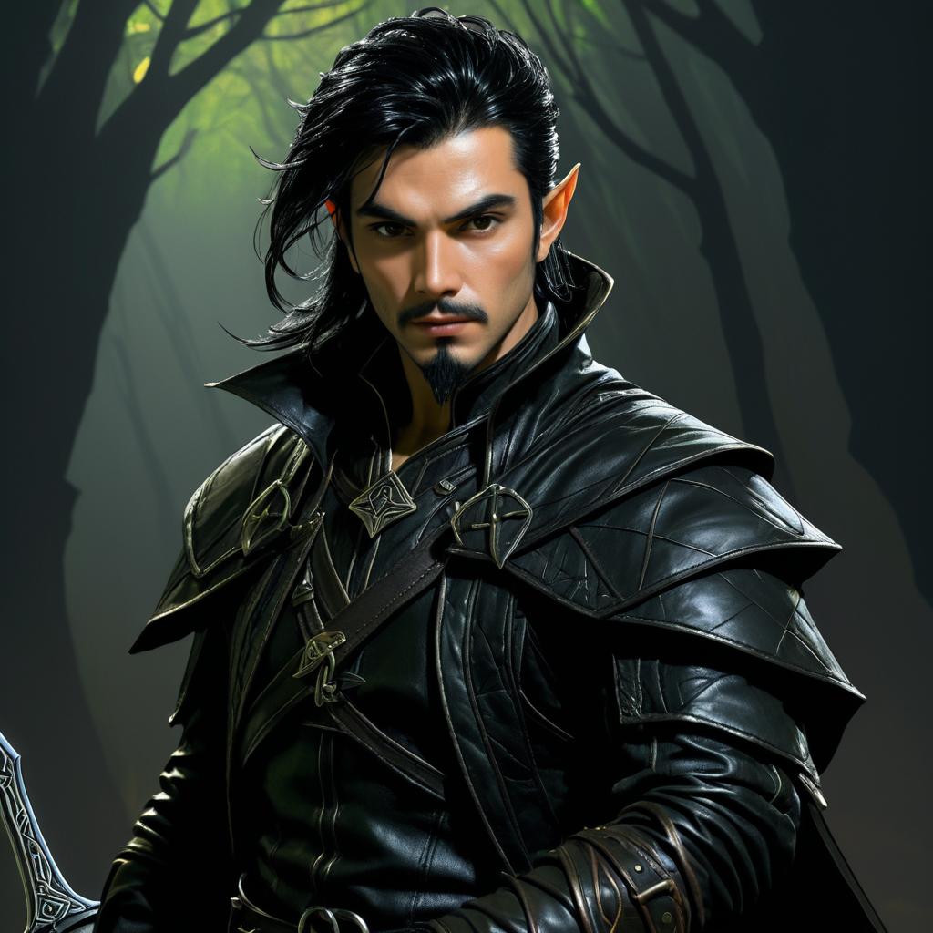 Artistic portrait of a cunning elven rogue character wearing detailed dark leather armor with intricate metal accents. The elf has long black hair tied back, pointed ears, and intense eyes, holding a finely crafted sword in a forest setting with green foliage and soft light filtering through the trees.