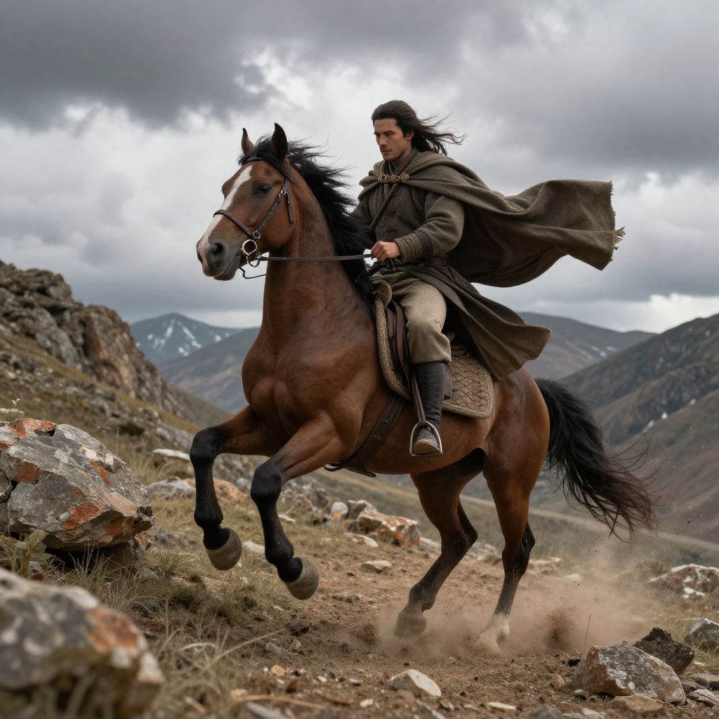 Majestic man riding horse on a rugged mountain trail, dramatic clouds overhead, powerful stance, windswept cloak, cinematic lighting, hyper-realistic action scene