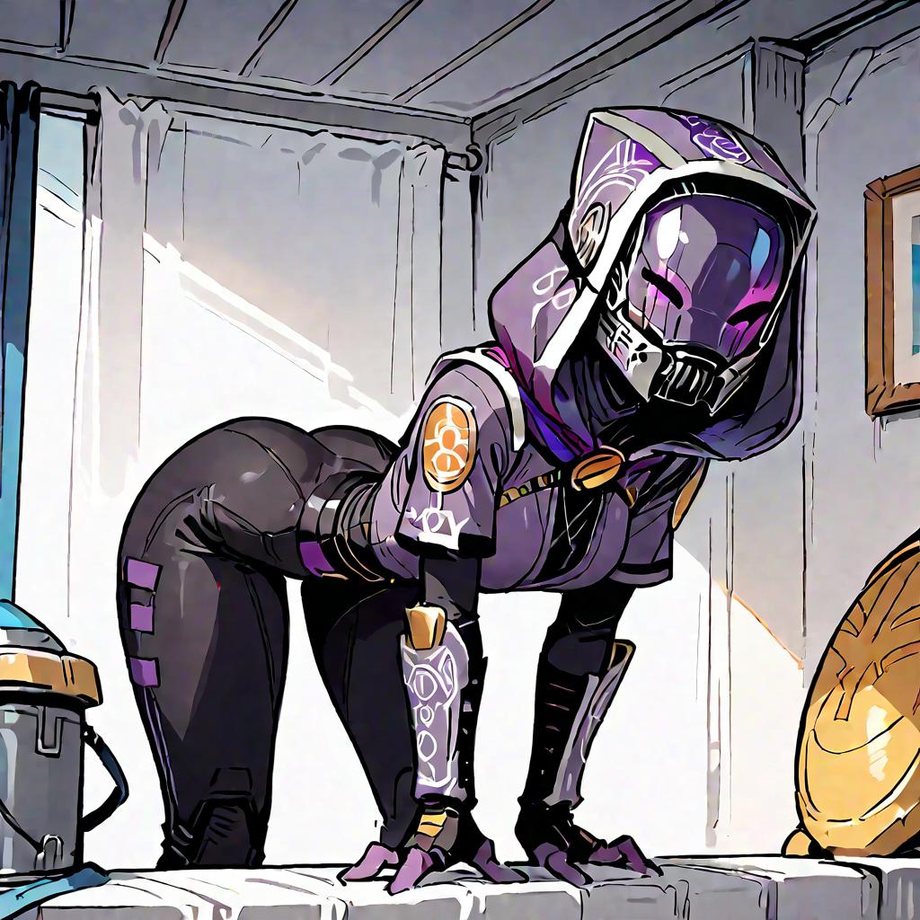 Score_9, score_8_up, score_7_up, score_6_up, score_5_up, score_4_up, source_furry, by aqe, tali, tali'zorah, quarian, 1girl, solo, (3 fingers:1.2), hood, purple bodysuit, mask, (helmet, faceless), hood up, alien, inside, bent over, (leaning forward), facing viewer, wide hips, purple clothing, black clothing, black bodysuit