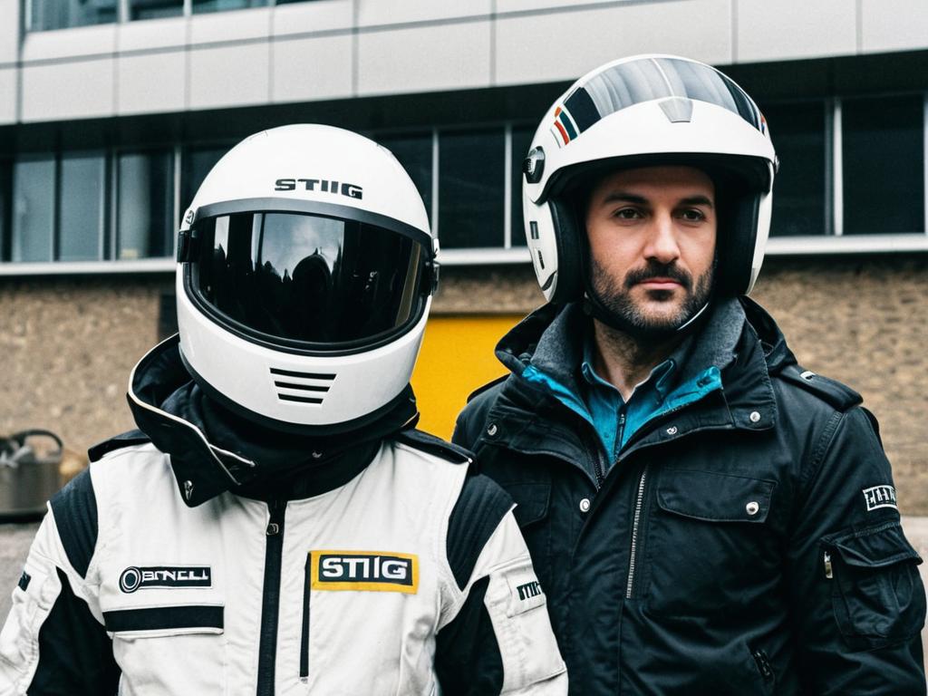 Race Car Driver Costume Man, man in a helmet and a black jacket in a garage