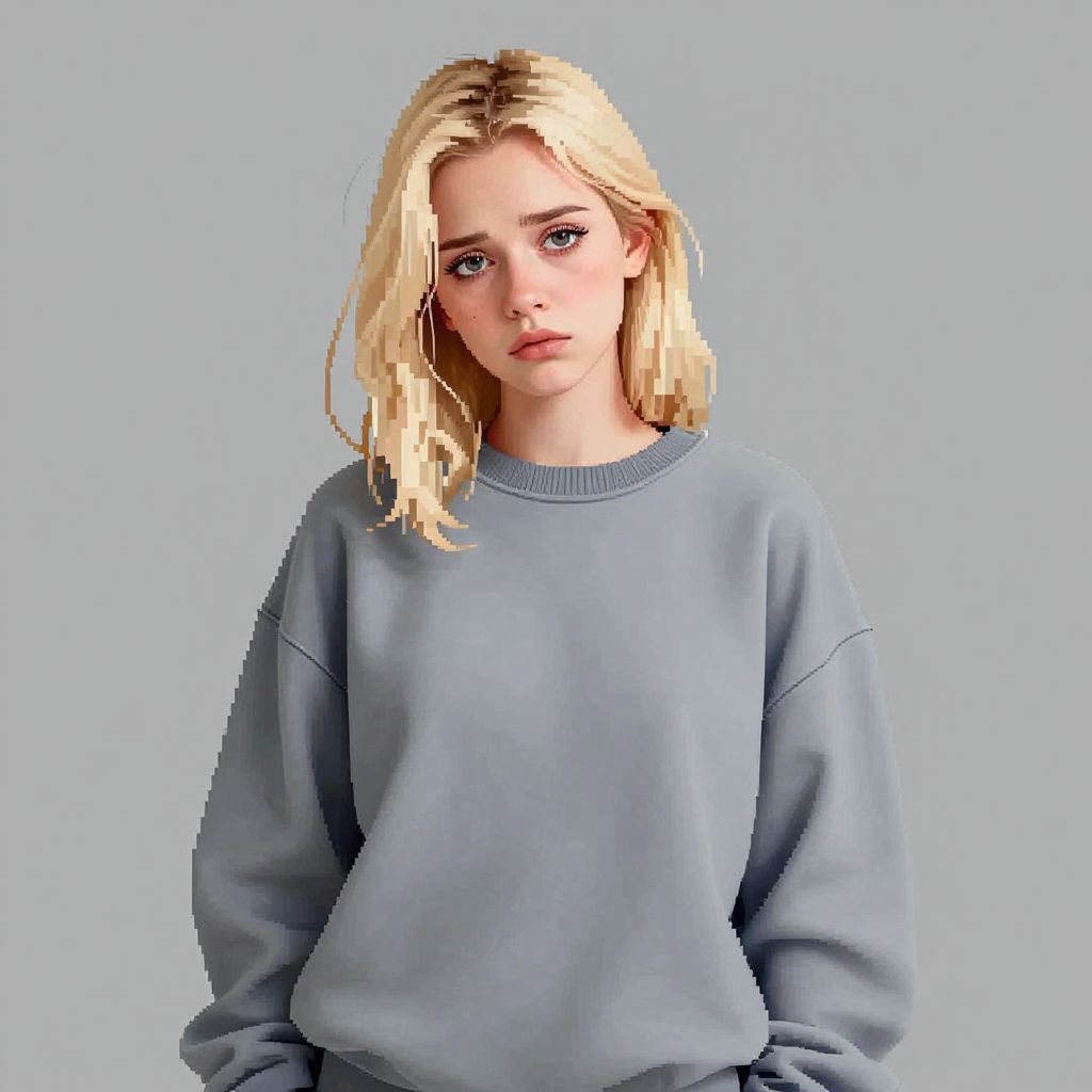 A tired young woman with blond hair and pale skin, wearing an oversized sweatshirt, gazes at the camera in a medium shot, rendered in a pixel art style reminiscent of Ashley Wood.