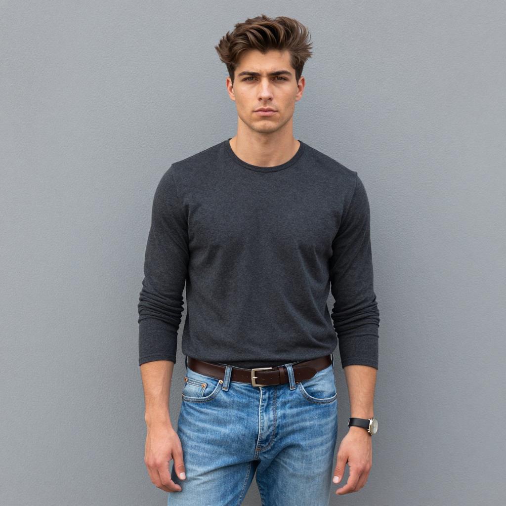 Cargo jeans man, photorealistic portrait of a handsome young man, brown hair, short styled, serious expression, wearing a gray long-sleeve shirt with a small pocket, blue jeans, brown belt, standing against a ured, dark gray, weathered wall, daylight, realistic shadows, casual style, modern fashion, upper body shot, realistic lighting, medium close-up, neutral background
