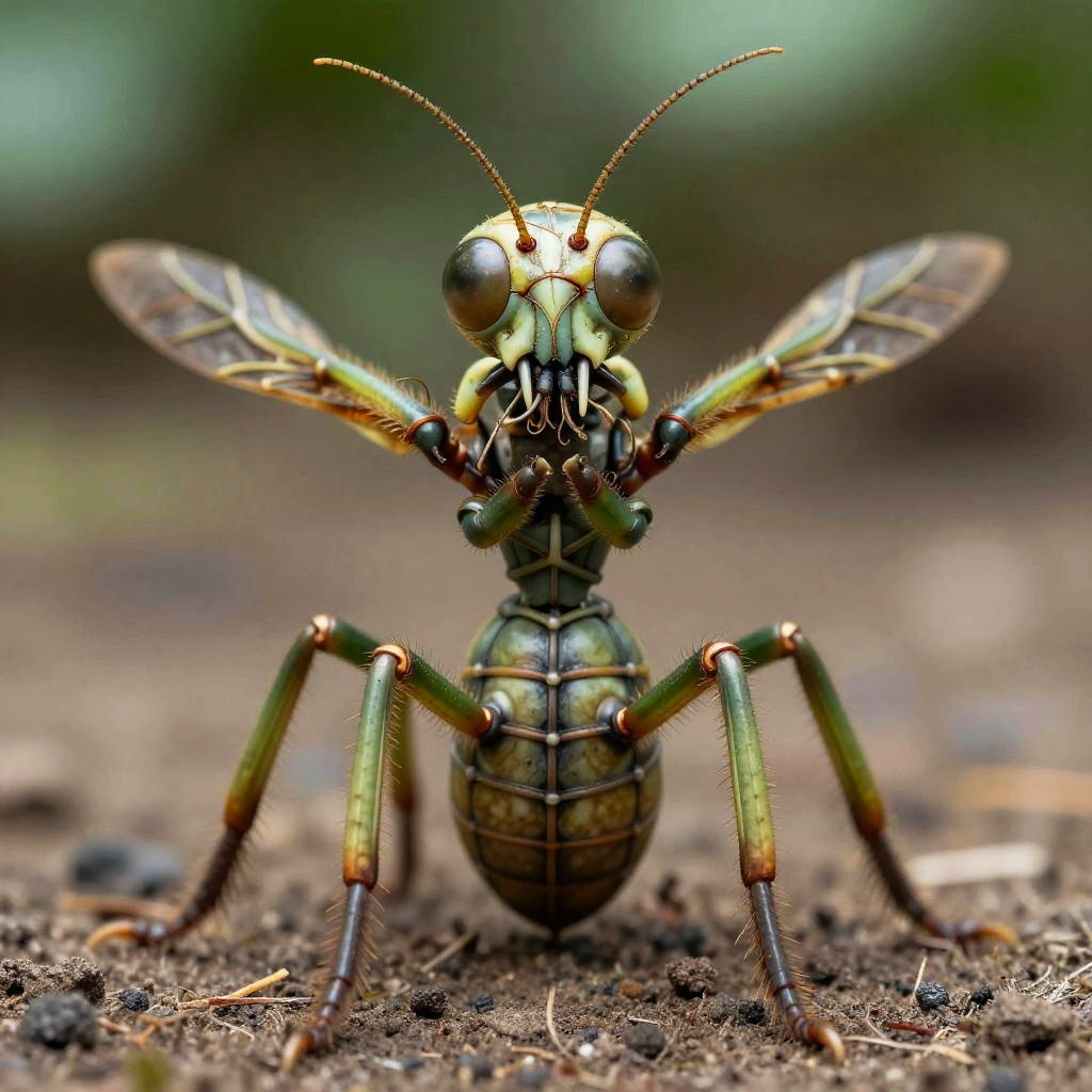 Close-up macro photograph of a unique verdant octopedal pollinator insect standing on soil. The insect features a skeletal-like head with two long antennae, large sunken light brown compound eyes, an indented jaw with tendrils, two short large arms, a skinny thorax with a thick waist, and an elongated, short stocky abdomen. Its eight short, powerful legs end in three-toed feet, displaying intricate vine-lattice patterns and textures in green and brown hues.