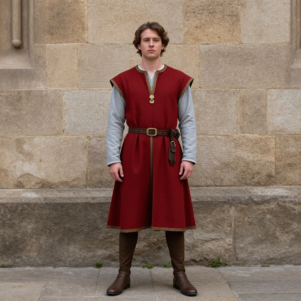 Photograph of a young man with curly brown hair, wearing a medieval-style red tunic, light blue shirt, brown belt, and boots, standing