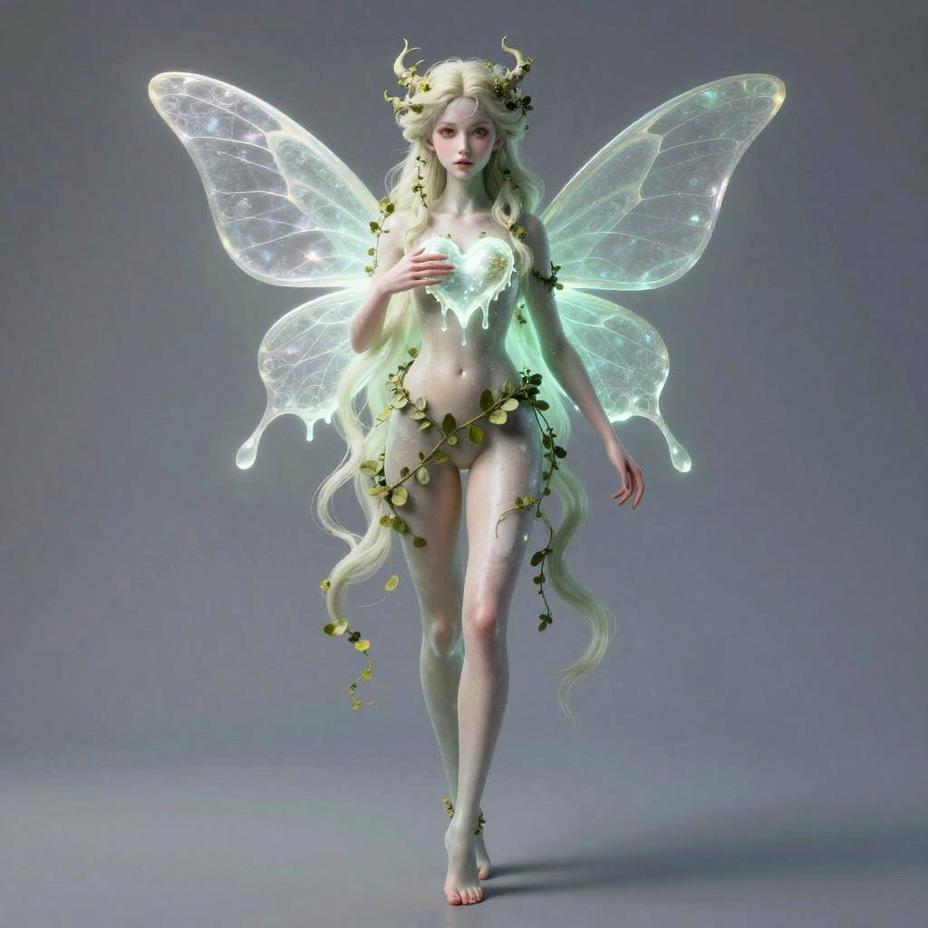 Digital CGI of a white deer with glowing antlers and a shiny red heart-shaped collar against a gradient gray background.