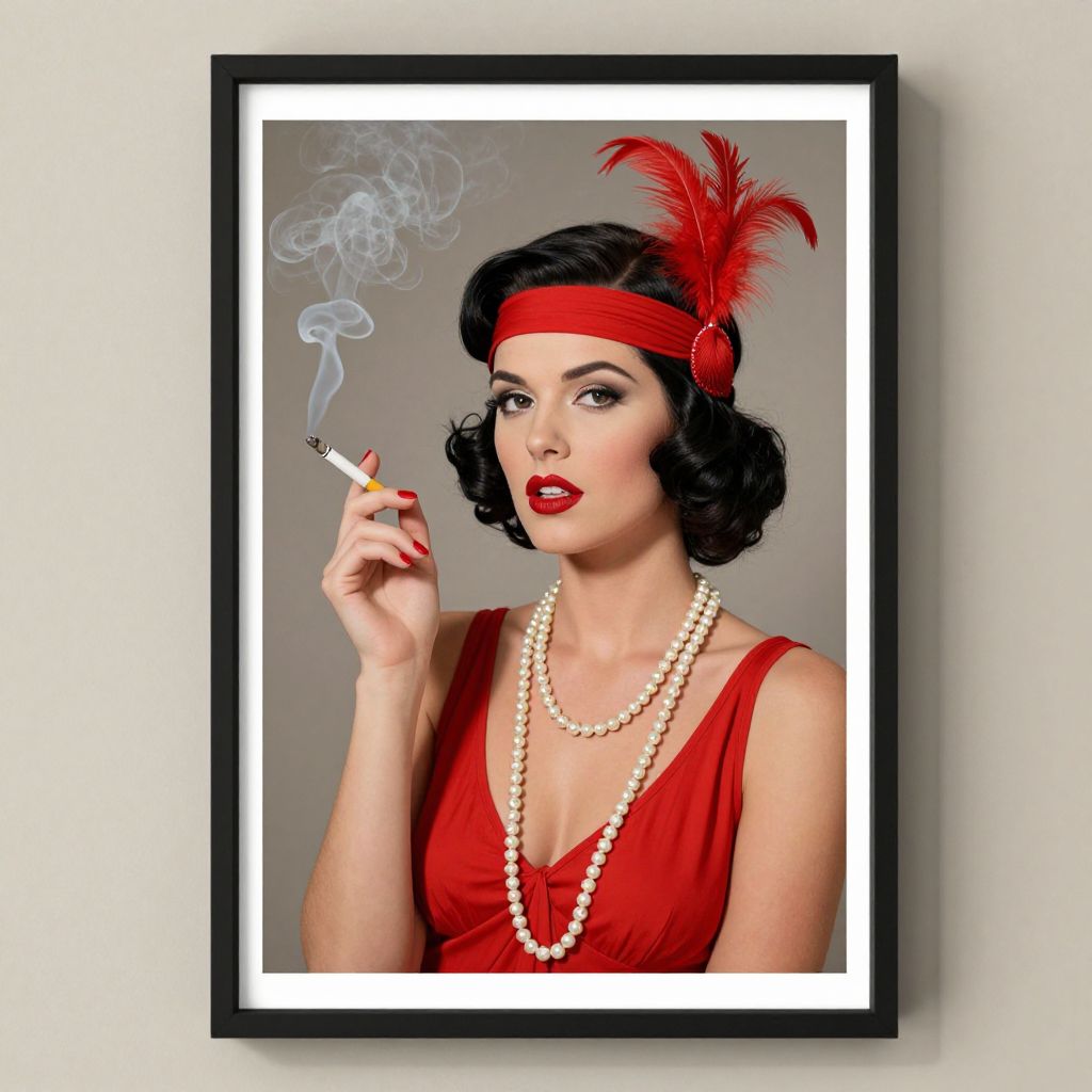 Photograph of a fair-skinned woman with black, wavy, vintage-style hair, wearing a red sleeveless dress, pearl necklace, and red headband adorned with a red feather. She holds a cigarette in her right hand, with smoke curling upwards. Her red lipstick matches her dress and headband. The background is a plain, light gray. The image is framed in a black frame with a white border, creating a classic, glamorous, 1920s flapper vibe. The woman's expression is confident and slightly sultry, enhancing the retro aesthetic.