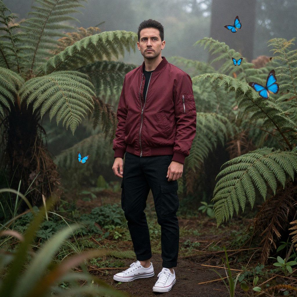 A man, burgundy bomber jacket, black tapered cargo pants, white low-top sneakers, misty undergrowth, towering ferns, vibrant blue butterflies fluttering, chromogenic film style, contemplative expression. Man has masculine face and piercing eyes