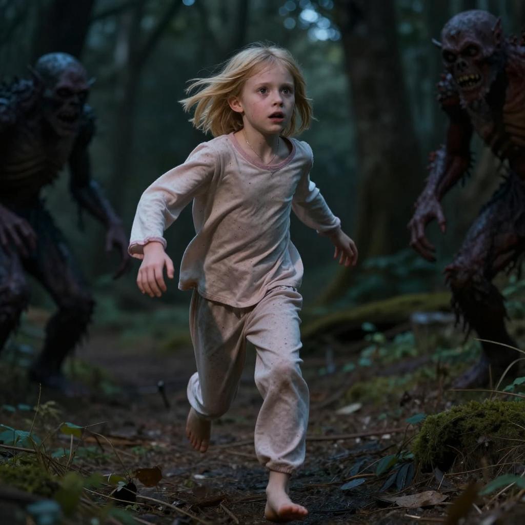 Woman Running from Monster in Rainy Forest