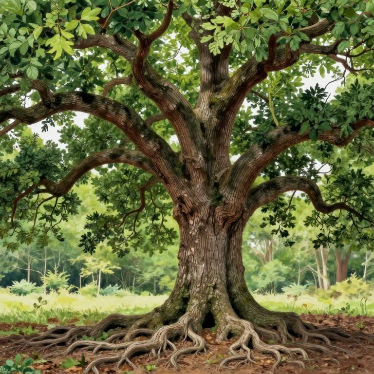 Stable drawing of a majestic oak tree with deep roots, intricate bark texture, lush green leaves, peaceful forest scene, midday lighting, photorealistic quality