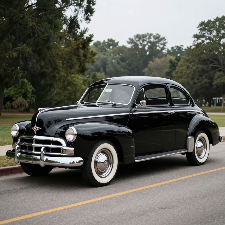 Shiny black 1948 Plymouth Deluxe Business Coupe parked gracefully on a paved road, showcasing its classic design with chrome accents, whitewall tires, and a sleek two-door body against a backdrop of dense trees and a hazy sky.
