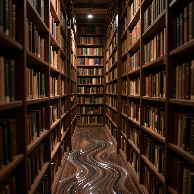 Photograph of a dimly lit library aisle, featuring tall wooden bookshelves on both sides filled with numerous books of varying sizes and colors. The shelves are evenly spaced and extend into the distance, creating a narrow, tunnel-like perspective. A wavy, metallic floor strip runs down the center, reflecting light and adding a modern, artistic touch. The background shows more shelves receding into the distance, illuminated by a single overhead light, enhancing the depth and warmth of the wooden shelves. The image conveys a sense of quiet, intellectual ambiance.