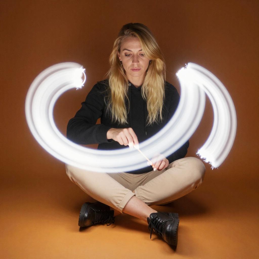 Photograph of a blonde woman with long hair, wearing a black hoodie, beige pants, and black shoes, sitting on an orange floor. She holds a light painting tool, creating swirling white light trails around her. Her expression is slightly blurred, adding a dynamic feel to the image.