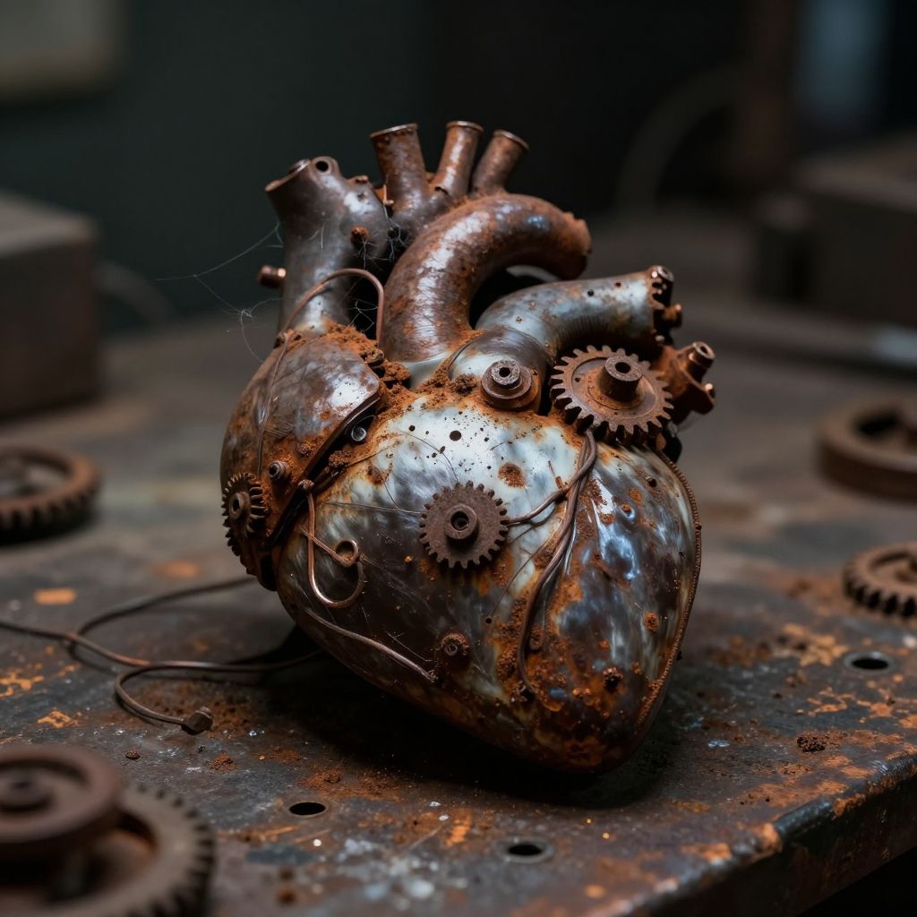 Photorealistic: A rusted automaton heart lies open on a weathered workbench. Gears and wires hang loose, their intricate mechanisms frozen in time. Cobwebs and dust cling to the once-functional machinery, hinting at a forgotten era of mechanical marvel. (Focus on heart, close up, bokeh, extremely detailed, chiaroscuro, low-key