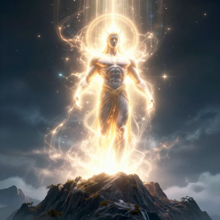 Gigachad god standing atop a mountain peak, glowing with divine aura, muscular frame radiating power, celestial light beams shining, epic fantasy style, ultra-detailed
