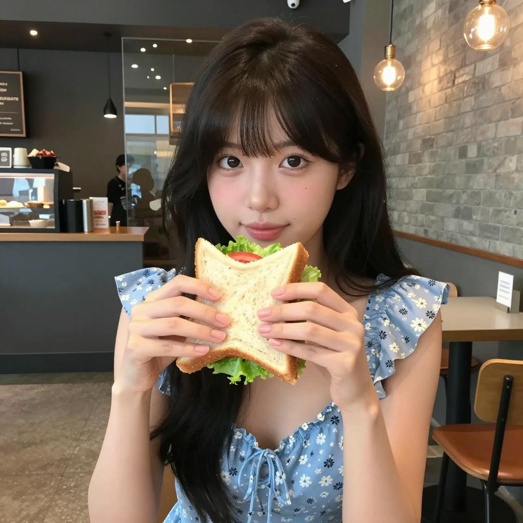 Asian woman with long dark hair and bangs, wearing a blue floral dress with a deep neckline, holding a sandwich with visible lettuce and tomato. She is sitting in a modern café, looking at the camera with a slight smile. Background includes a counter and hanging lights. Textured brick wall and glass partition behind her. She is holding the sandwich in both hands near her chest. Image is a photograph.