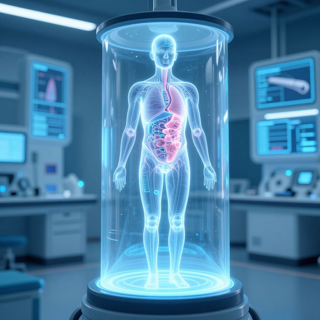 Digital CGI of a glowing, transparent human figure with a visible heart inside a cylindrical blue-lit medical chamber in a futuristic lab.