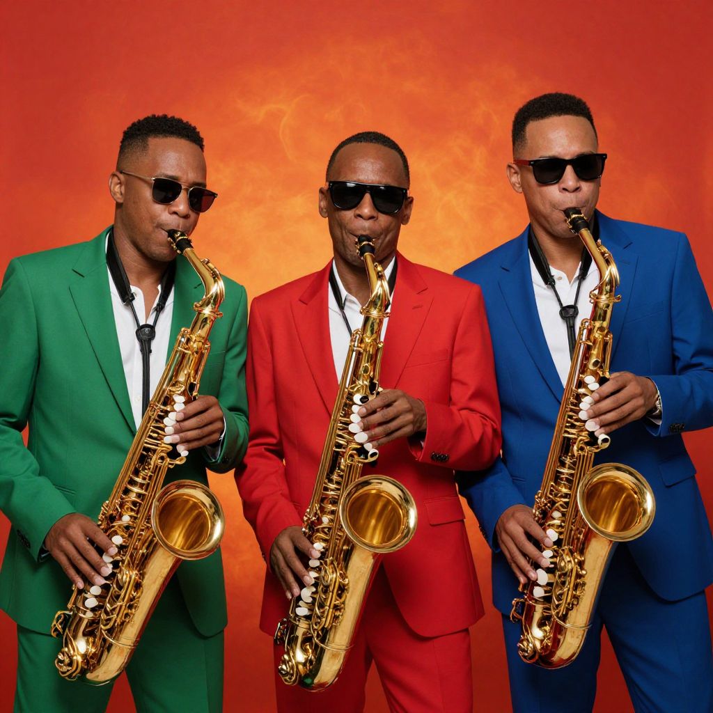 Vibrant jazz trio portrait featuring three men in stylish suits—green, red, and blue—each adorned with sunglasses and playing golden saxophones against a fiery orange-red background.