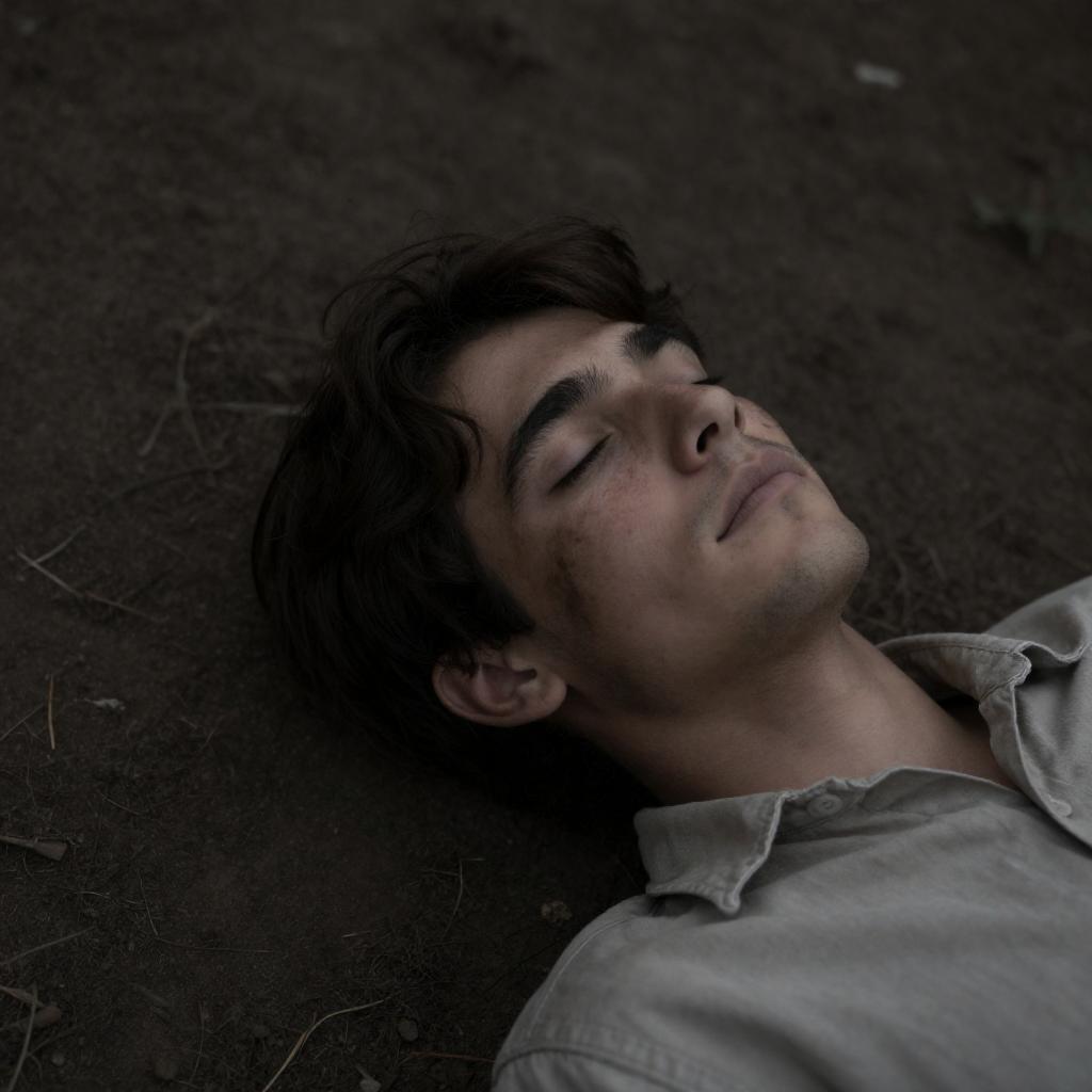 Photograph of a young man with dark brown hair and closed eyes, lying on a dirt ground. His face is slightly dirty, and he wears a light-colored shirt. The background is dark and ured with dirt and sparse vegetation. The lighting is low, creating a somber mood.