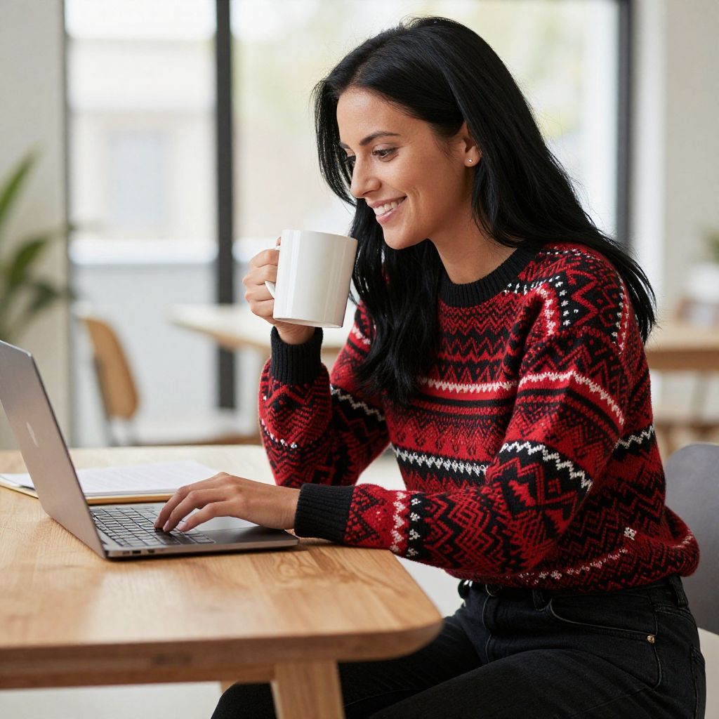 Photograph of a smiling woman with long black hair, wearing a red and black patterned sweater and black jeans, sitting at a wooden desk. She's holding a white mug in her right hand and typing on a laptop with her left. The background is blurred, suggesting an indoor, sunlit room with large windows. The overall vibe is cozy and relaxed.