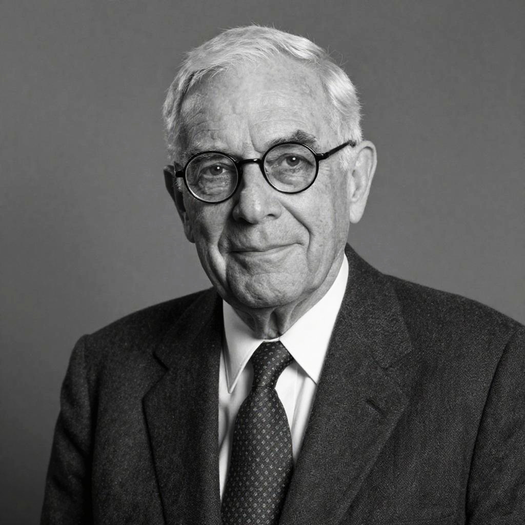 This black-and-white photo shows an older man with short, light-colored hair and round glasses. He's wearing a dark, textured suit jacket over a white shirt with a patterned tie. The background is a plain, gradient gray, focusing attention on his serious yet slightly smiling expression. The image has a vintage, slightly grainy texture.