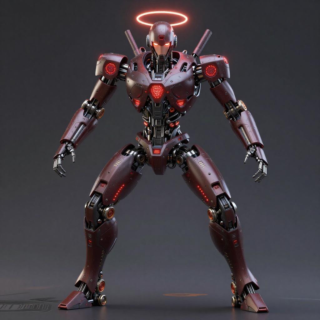 Masterpiece, best quality, ultra-detailed, intricate, highly detailed, high resolution, realistic, HD, 8K, 1man, humanoid robot, dynamic pose, an extremely delicate mecha, glowing dark red led parts, full body, High tech background, rim light, science fiction, (By Marek Okon:1.3), psychedelic, halo, nsfw