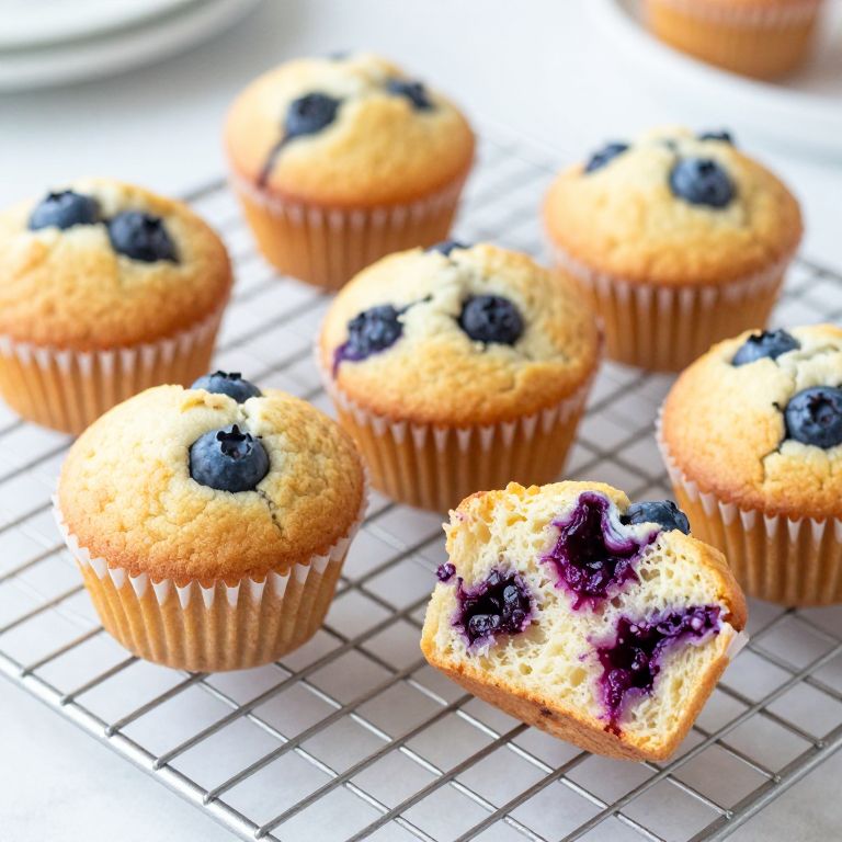 Six golden-blueberry muffins rest on a cooling rack, with one halved to reveal its moist interior and vibrant purple berries, showcasing a quick and easy breakfast treat.