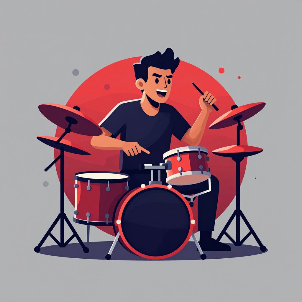 Cartoon illustration of a black-haired man in a black shirt playing a red drum set against a large red circle on light blue background.