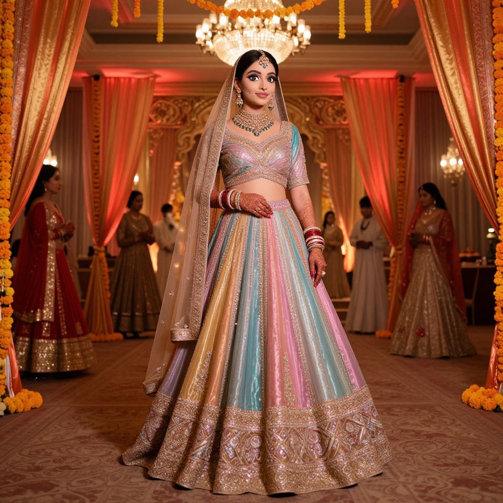 An elegant bride in a shimmering multicolor bridal lehenga costume, with large expressive eyes and a perfectly shaped nose, posing in a royal-style wedding hall adorned with marigold flowers, silk banners, and red and gold lighting, surrounded by traditional dance outfits and guests.