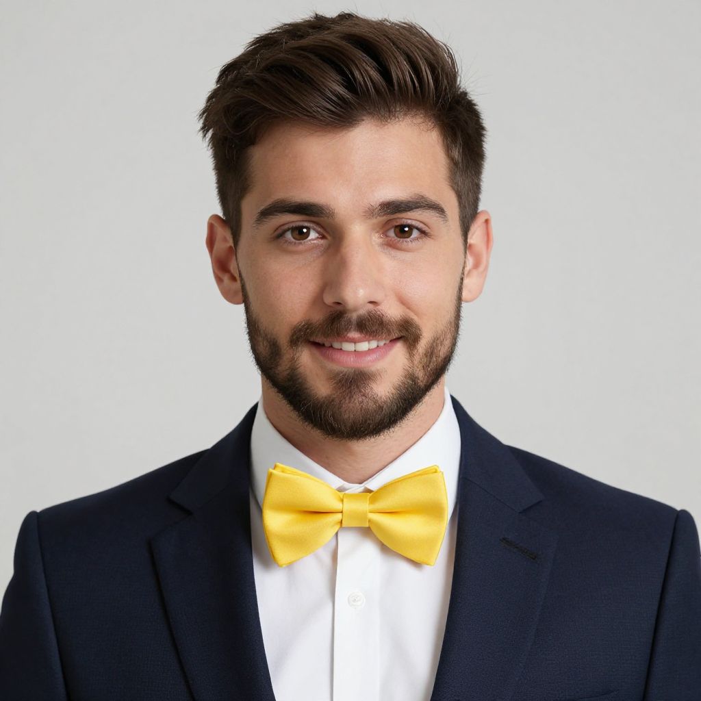 "formal wear male party, male focus, bow, bowtie, facial hair, 1boy, formal, suit, looking at viewer, beard, smile, brown hair, jacket, mustache, tuxedo, yellow bow, solo focus, yellow bowtie, white shirt, brown eyes Realistic photo of casual sexy person with pretty face"