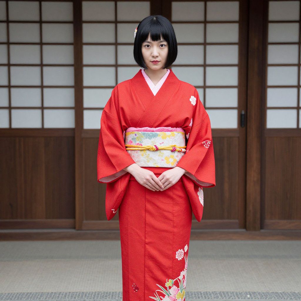 Photograph of a young Asian woman with a black bob haircut, wearing a vibrant red traditional kimono with floral patterns, standing in front of a wooden