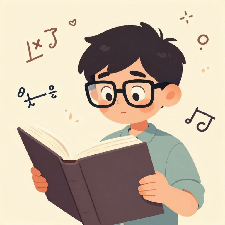 Cartoon with thick glasses featuring a nerdy teenager reading a giant book, surrounded by floating math formulas and doodles, expressive face, soft pastel colors, whimsical vibe