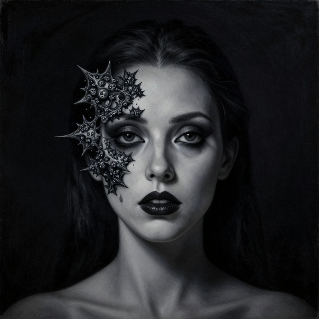 Digital artwork of a pale-skinned woman with dark, dramatic makeup, featuring black lipstick and heavily shadowed eyes. Her straight, dark hair is parted in the middle, with one side adorned with intricate, black, star-shaped patterns that cover her left eye and extend across her temple. The background is a deep, black gradient, emphasizing the ethereal and gothic style. The image uses high-contrast, monochromatic blue tones, creating a mysterious and surreal atmosphere. The woman's expression is intense and somewhat haunting, with a slight, enigmatic smile.