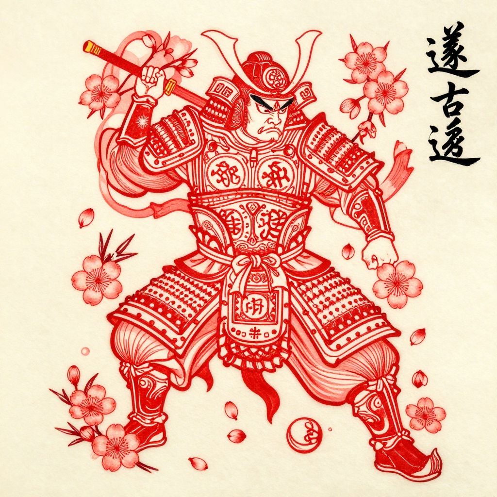 Chinese tattoo of a warrior, bold line art with red and black ink, detailed samurai armor, mystical symbols and cherry blossoms surrounding, ancient calligraphy elements, fierce battle stance