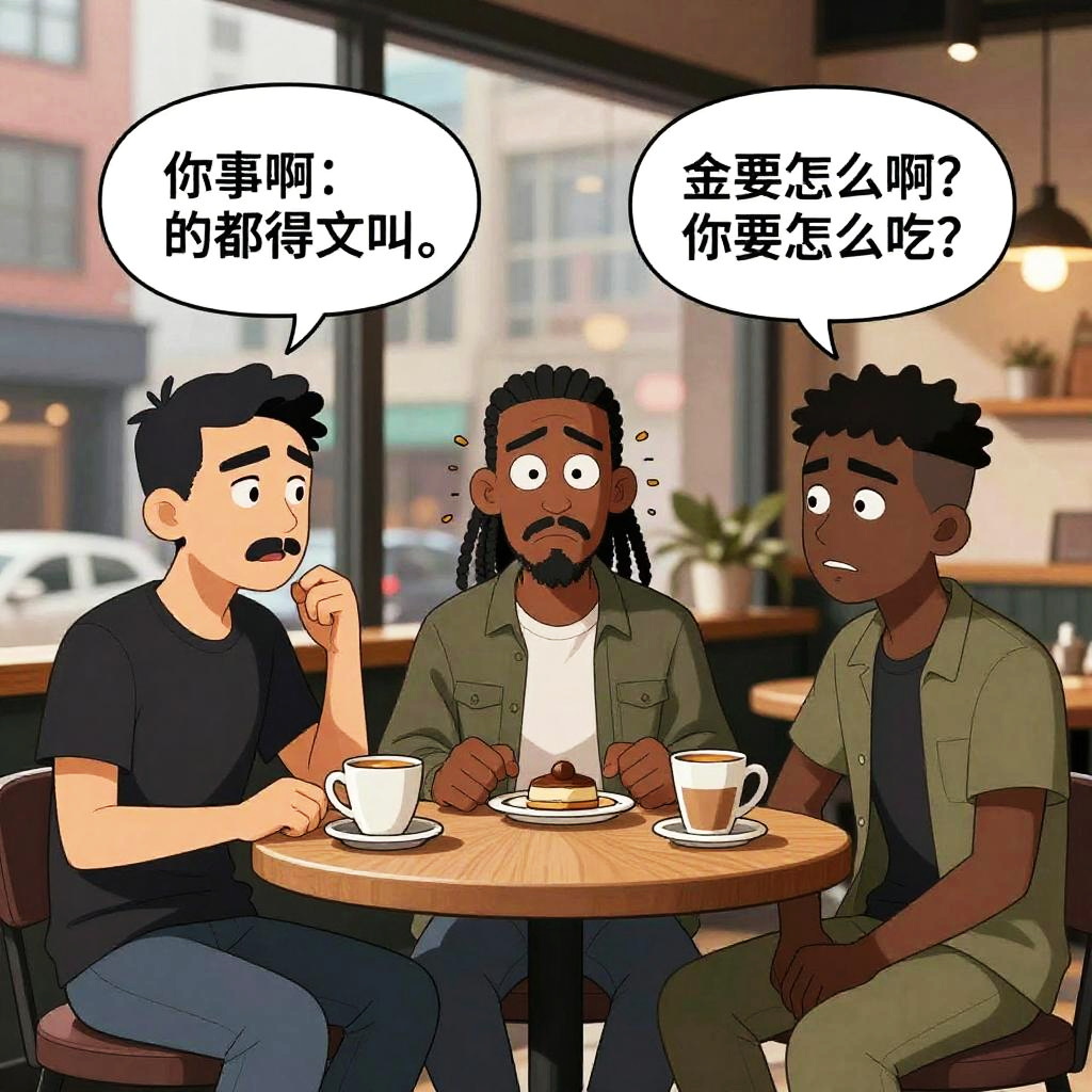 Custom Boondocks characters depicted in an intense debate scene inside a stylish urban café, crisp and vivid cartoon style, strong lighting contrasts highlighting emotions, layered background with city life blurred, focusing on expressive gestures and sharp dialogue atmosphere.