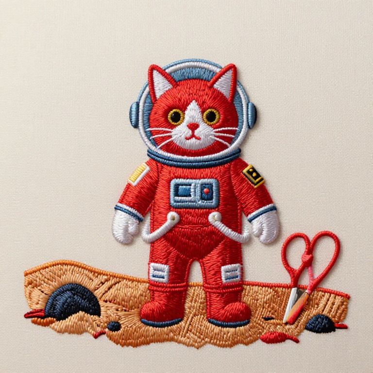 Detailed embroidery patch of a red cat wearing a blue and white spacesuit standing on an orange surface resembling Mars. A pair of red embroidery scissors is also included on the patch next to the cat. The design features realistic stitching with intricate thread texture and vibrant colors on a neutral fabric background.